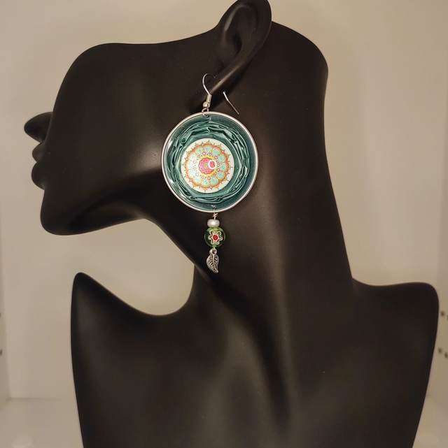 Boucles d’oreilles artisanales en capsule de café recyclée, sublimées par un cabochon en résine aux motifs mandala colorés.